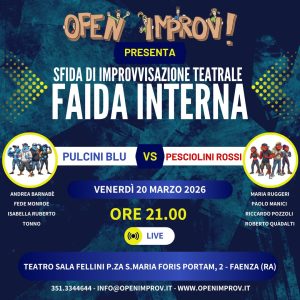Faida – spettacolo di improvvisazione teatrale Nella vigilia di primavera dovrai scegliere se Aria o Acqua.Cielo o Mare?Nuvola o Onda?Pio pio pio o glu glu glu?Pulcini Blu o Pesciolini Rossi? Chi inaugurerà la bella stagione con una vittoria?Cosa succederà nella quinta Faida di 𝐢𝐦𝐩𝐫𝐨𝐯𝐯𝐢𝐬𝐚𝐳𝐢𝐨𝐧𝐞 𝐭𝐞𝐚𝐭𝐫𝐚𝐥𝐞? Le formazioni: 🤜🤛🐥 𝐏𝐮𝐥𝐜𝐢𝐧𝐢 𝐁𝐥𝐮:Andrea Barnabè, Fede Monroe, Isabella Ruberto,…
